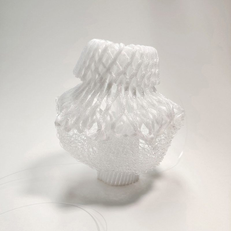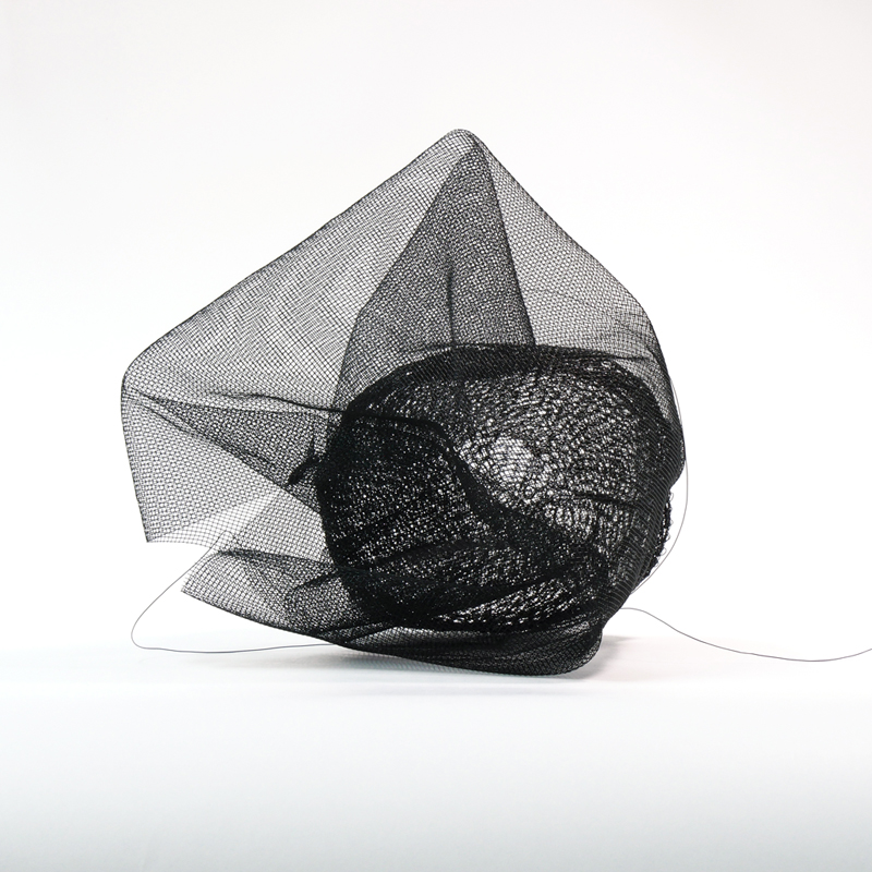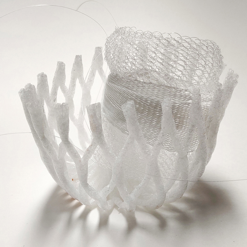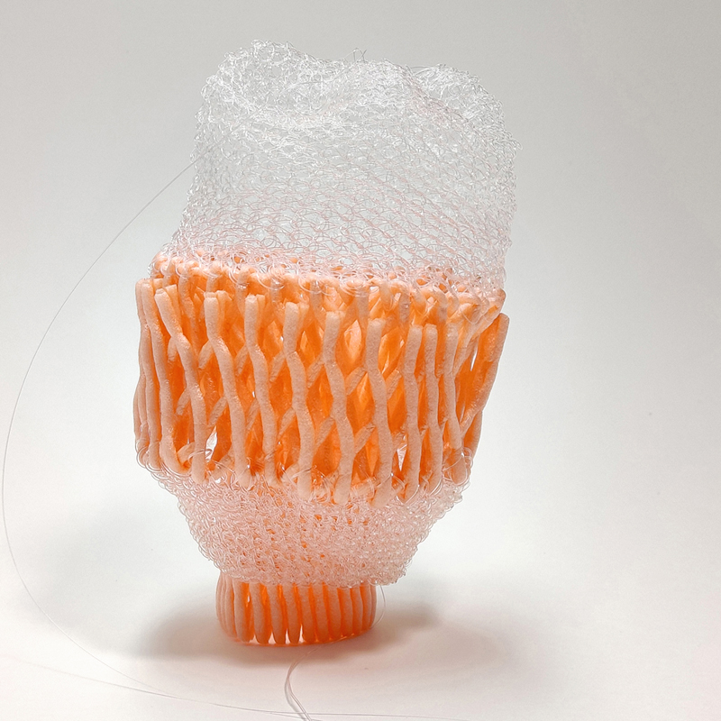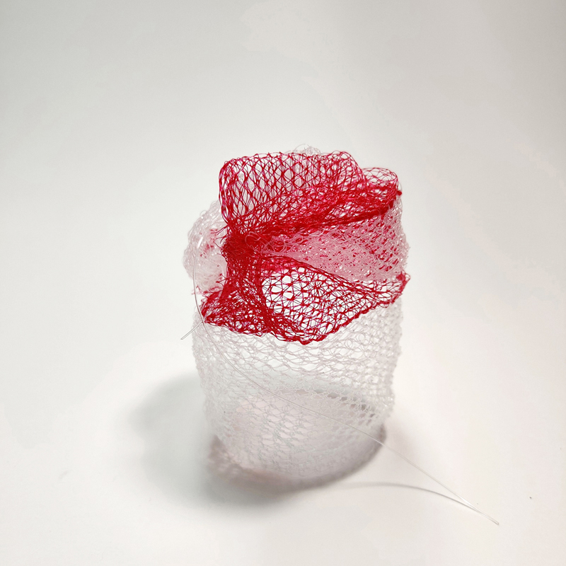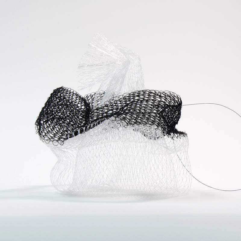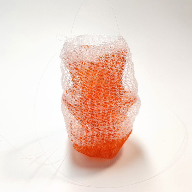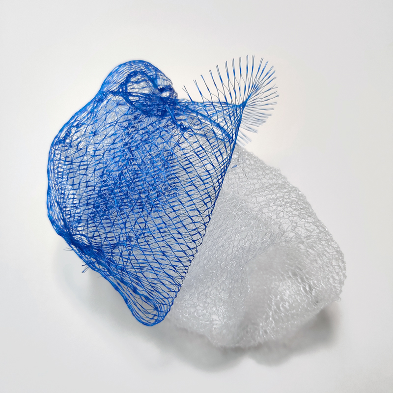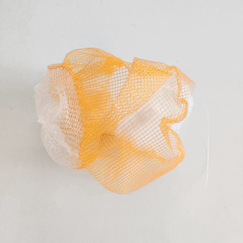 Netzkörper aus Gemüsenetzen mit Perlonfaden ‚verhäkelt‘,
